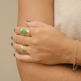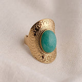 Inel din otel inoxidabil, placat cu aur de 18K, ornat cu piatra turcoaz, cabochon oval. Inelul este deschis in partea de jos, permitand o mica reglare.